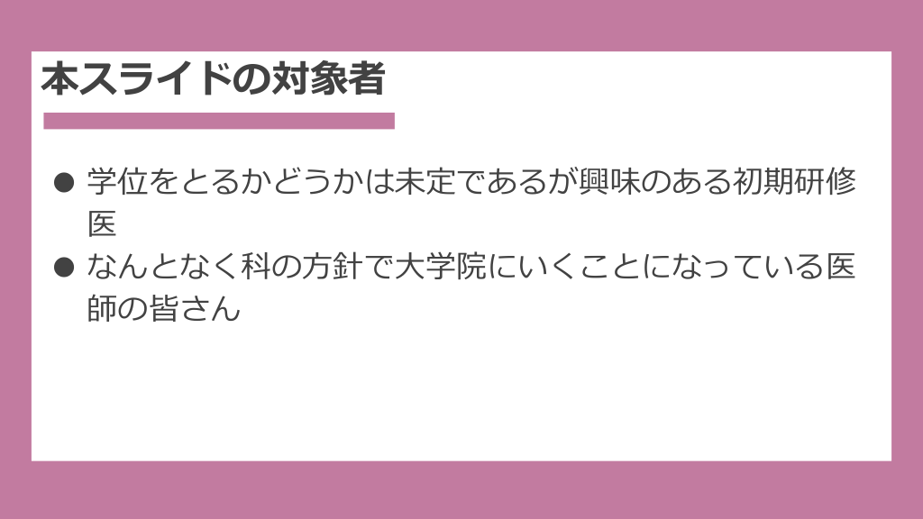 学位取得に興味はあるが未定の初期研修医、または大学院進学を検討している医師に向けた内容です。医師としての専門性を高め、医学の進歩に貢献するために学位は必要なのか、その答えを求める医師の一助となることを目指しました。