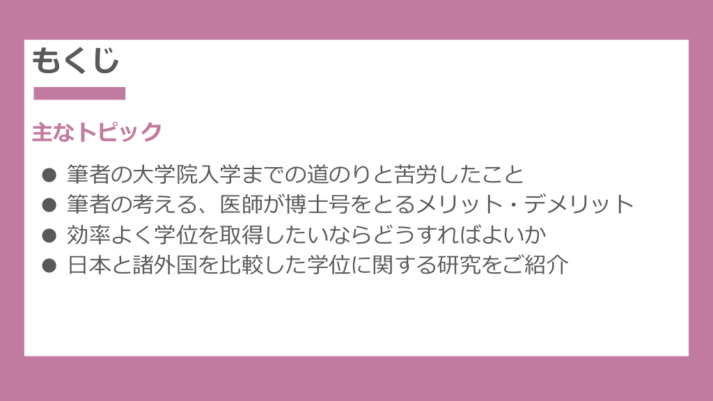 特に、無知から来る苦労や、学位取得後のキャリアに与える影響、結婚・出産とのタイミング、そして最終的にはどのようにして大学院を卒業したのか、という実体験を記載しました。
