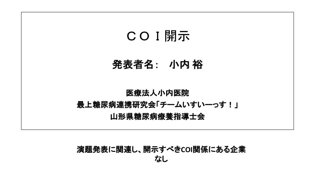 #2. COI開示 発表者名: 小内 裕 医療法人小内医院 最上糖尿病連携研究会「チームいすいーっす!」 山形県糖尿病療養指導士会 演題発表に関連し、開示すべきCOI関係にある企業 なし