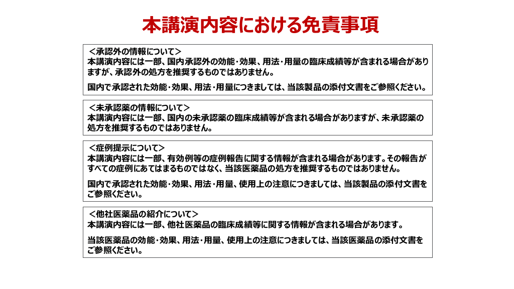 #3. 本講演内容における免責事項 <承認外の情報について> 本講演内容には⼀部、国内承認外の効能・効果、⽤法・⽤量の臨床成績等が含まれる場合があり ますが、承認外の処⽅を推奨するものではありません。 国内で承認された効能・効果、⽤法・⽤量につきましては、当該製品の添付⽂書をご参照ください。 <未承認薬の情報について> 本講演内容には⼀部、国内の未承認薬の臨床成績等が含まれる場合がありますが、未承認薬の 処⽅を推奨するものではありません。 <症例提⽰について> 本講演内容には⼀部、有効例等の症例報告に関する情報が含まれる場合があります。その報告が すべての症例にあてはまるものではなく、当該医薬品の処⽅を推奨するものではありません。 国内で承認された効能・効果、⽤法・⽤量、使⽤上の注意につきましては、当該製品の添付⽂書を ご参照ください。 <他社医薬品の紹介について> 本講演内容には⼀部、他社医薬品の臨床成績等に関する情報が含まれる場合があります。 当該医薬品の効能・効果、⽤法・⽤量、使⽤上の注意につきましては、当該医薬品の添付⽂書を ご参照ください。