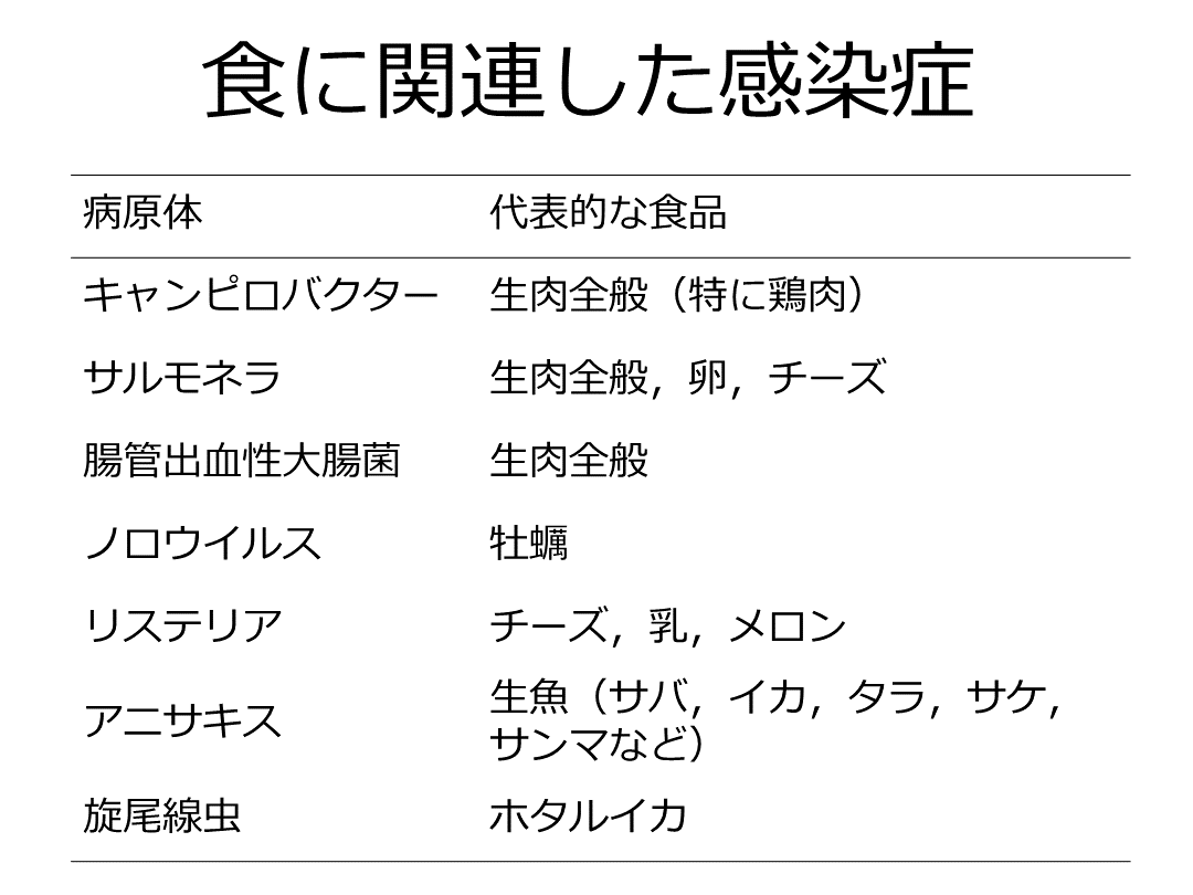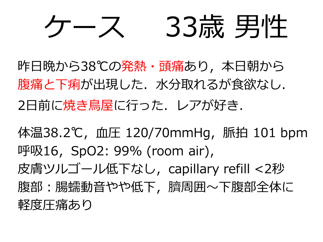 2日前に焼き鳥屋に行った.レアが好き. 33歳 男性 体温38.2℃,血圧 120/70mmHg,脈拍 101 bpm