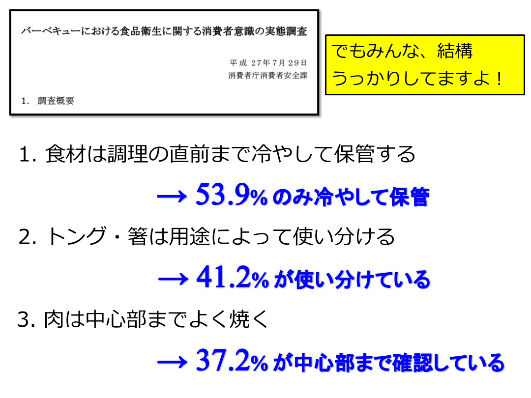 #13. 1. 食材は調理の直前まで冷やして保管する 2. トング・箸は用途によって使い分ける 3. 肉は中心部までよく焼く → 53.9% のみ冷やして保管 → 41.2% が使い分けている → 37.2% が中心部まで確認している でもみんな、結構