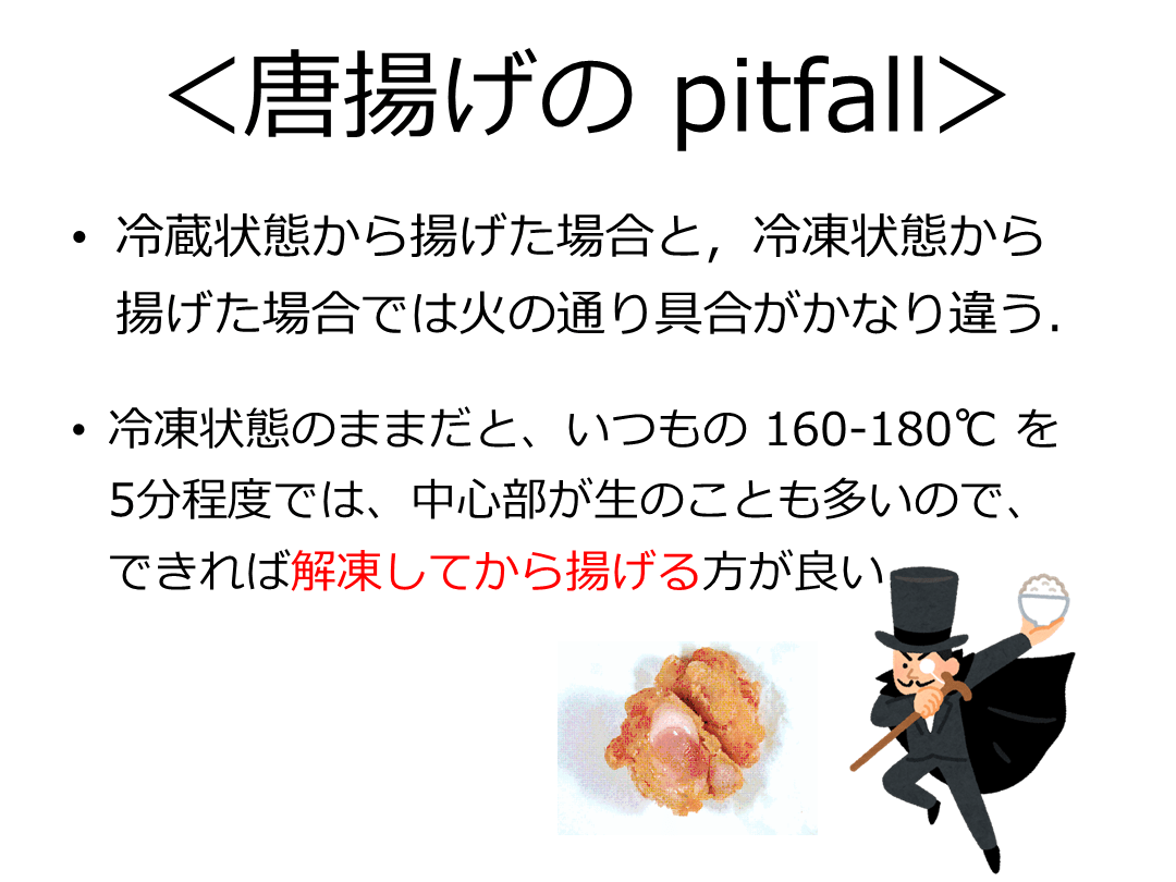 #14. <唐揚げの pitfall> 冷蔵状態から揚げた場合と,冷凍状態から揚げた場合では火の通り具合がかなり違う. 冷凍状態のままだと、いつもの 160-180℃ を 5分程度では、中心部が生のことも多いので、できれば解凍してから揚げる方が良い.