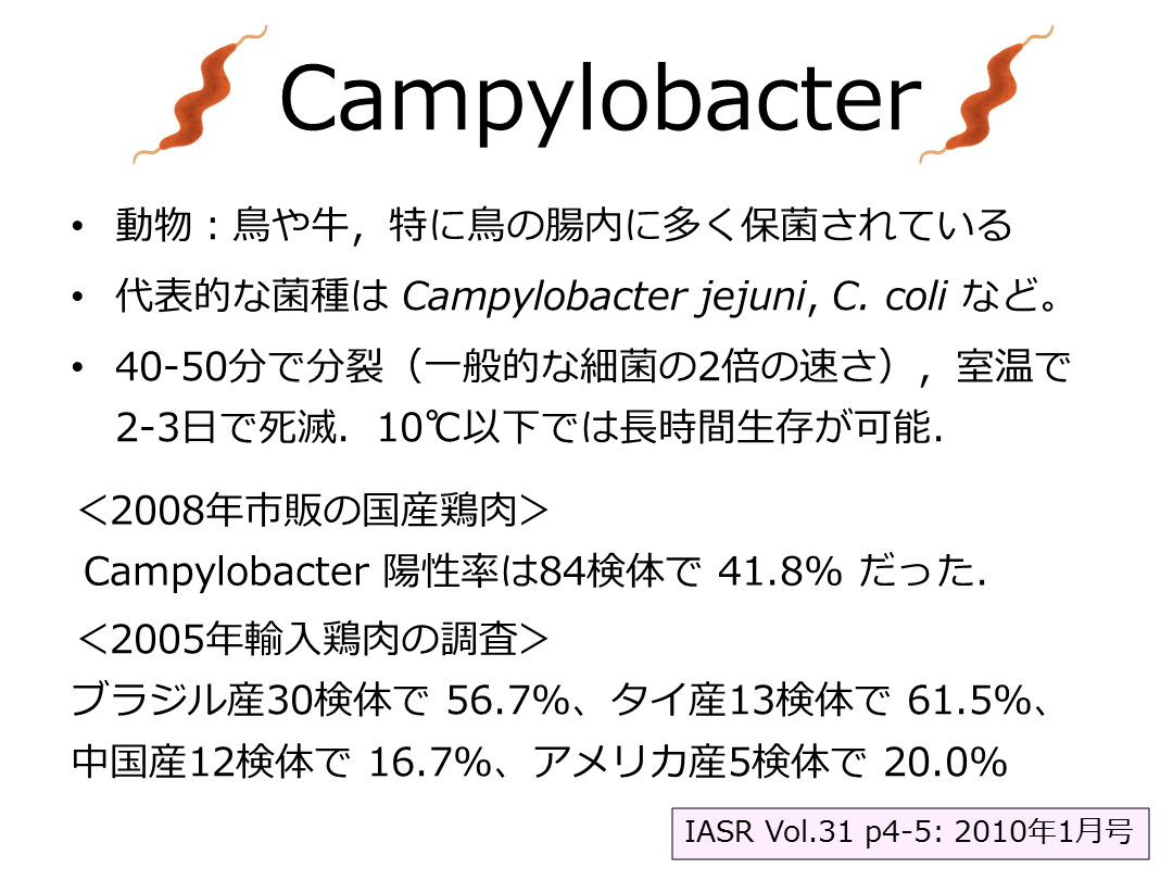 40-50分で分裂(一般的な細菌の2倍の速さ),室温で2-3日で死滅.10℃以下では長時間生存が可能. IASR Vol.31 p4-5: 2010年1月号 <2008年市販の国産鶏肉>