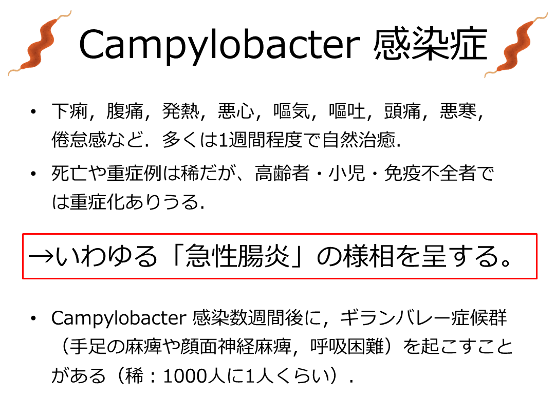 死亡や重症例は稀だが、高齢者・小児・免疫不全者では重症化ありうる. Campylobacter 感染数週間後に,ギランバレー症候群(手足の麻痺や顔面神経麻痺,呼吸困難)を起こすことがある(稀:1000人に1人くらい). →いわゆる「急性腸炎」の様相を呈する。 Campylobacter 感染症