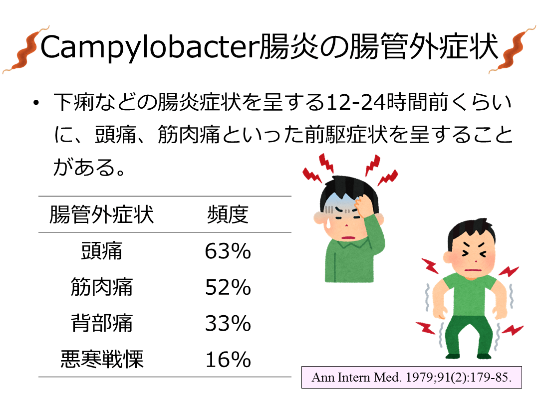 #19. Campylobacter腸炎の腸管外症状 下痢などの腸炎症状を呈する12-24時間前くらいに、頭痛、筋肉痛といった前駆症状を呈することがある。 Ann Intern Med. 1979;91(2):179-85.