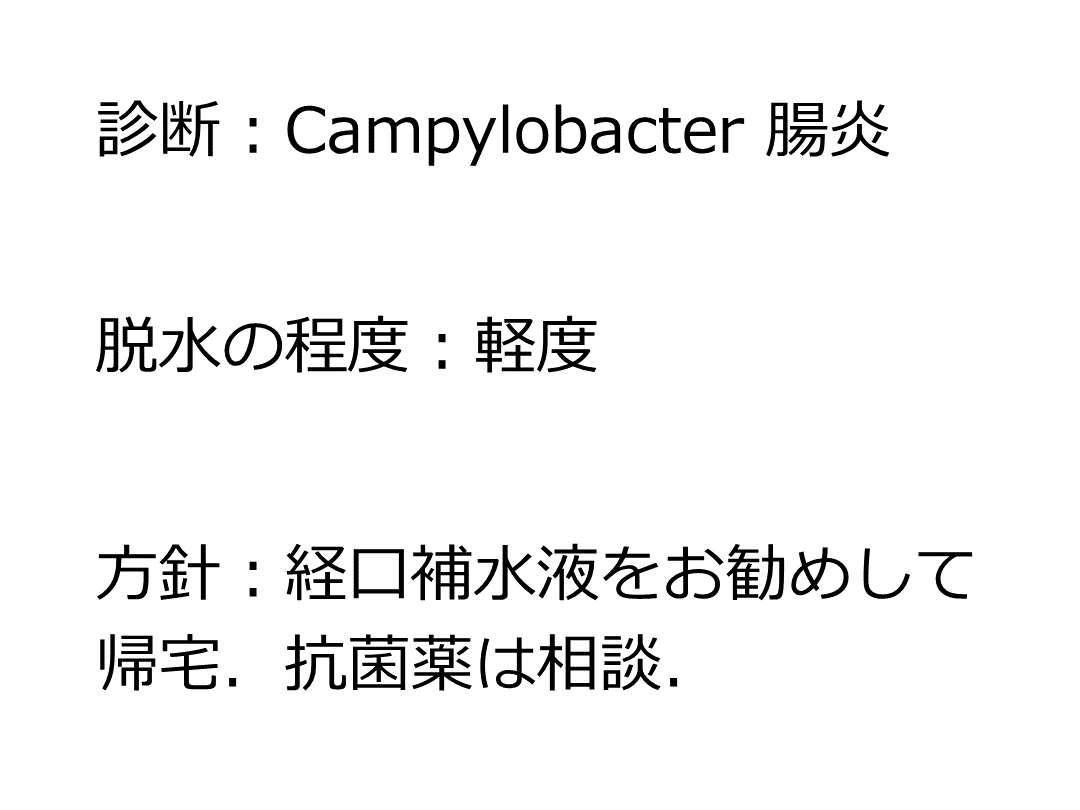#22. 診断:Campylobacter 腸炎 脱水の程度:軽度 方針:経口補水液をお勧めして帰宅.抗菌薬は相談.