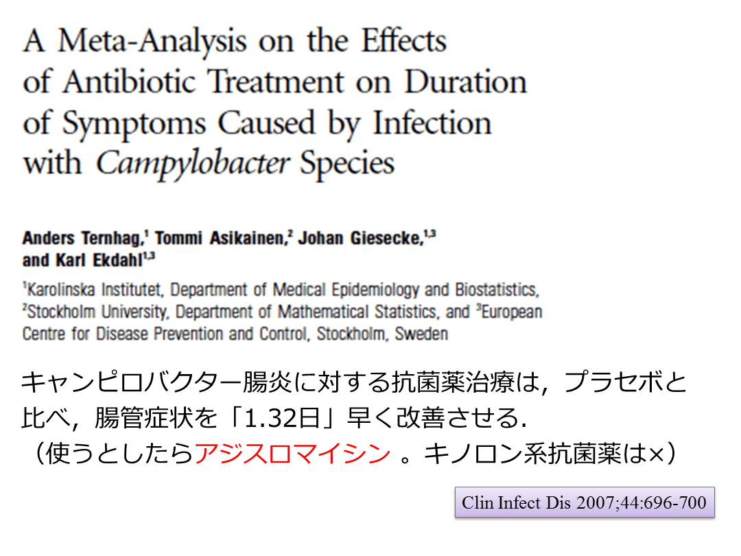 #23. キャンピロバクター腸炎に対する抗菌薬治療は,プラセボと比べ,腸管症状を「1.32日」早く改善させる.