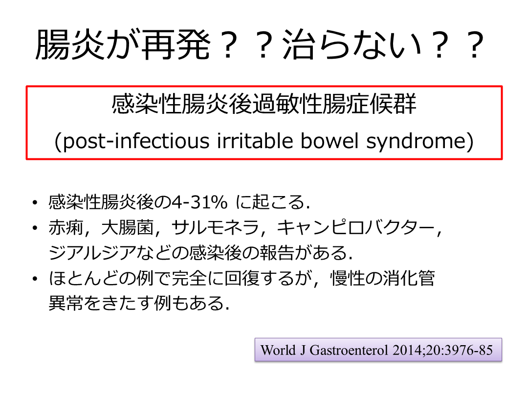 (post-infectious irritable bowel syndrome) World J Gastroenterol 2014;20:3976-85 感染性腸炎後の4-31% に起こる.