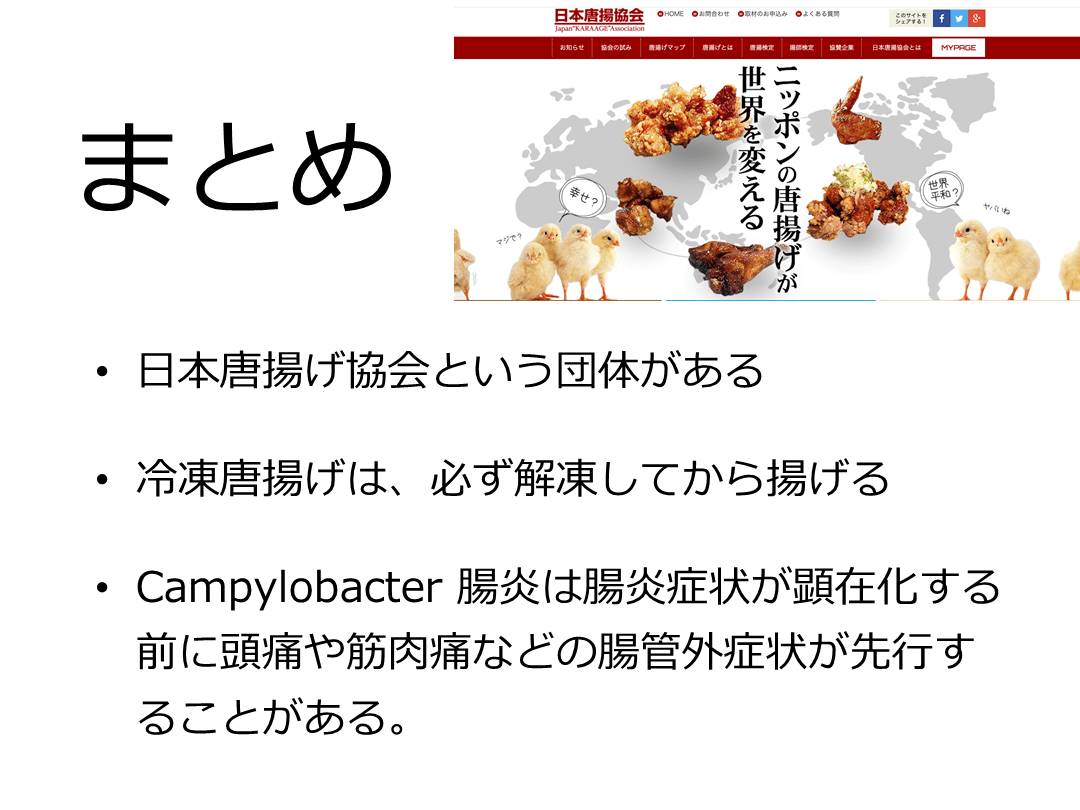 #25. まとめ 日本唐揚げ協会という団体がある 冷凍唐揚げは、必ず解凍してから揚げる Campylobacter 腸炎は腸炎症状が顕在化する前に頭痛や筋肉痛などの腸管外症状が先行することがある。