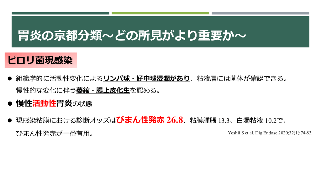 胃炎の京都分類〜どの所⾒がより重要か〜 ピロリ菌現感染 l 組織学的に活動性変化によるリンパ球・好中球浸潤があり、粘液層には菌体が確認できる。 慢性的な変化に伴う萎縮・腸上⽪化⽣を認める。 l 慢性活動性胃炎の状態 l 現感染粘膜における診断オッズはびまん性発⾚ びまん性発⾚が⼀番有⽤。 26.8、粘膜腫脹 13.3、⽩濁粘液 10.2で、 Yoshii S et al. Dig Endosc 2020;32(1):74-83.