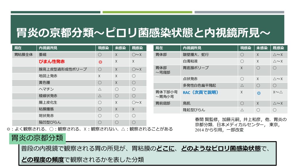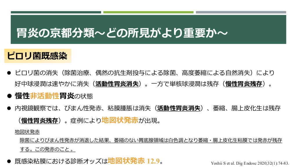 胃炎の京都分類〜どの所⾒がより重要か〜 ピロリ菌既感染 l ピロリ菌の消失(除菌治療、偶然の抗⽣剤投与による除菌、⾼度萎縮による⾃然消失)により 好中球浸潤は速やかに消失(活動性胃炎消失)。⼀⽅で単核球浸潤は残存(慢性胃炎残存)。 l 慢性⾮活動性胃炎の状態 l 内視鏡観察では、びまん性発⾚、粘膜腫脹は消失(活動性胃炎消失)、萎縮、腸上⽪化⽣は残存 (慢性胃炎残存)。症例により地図状発⾚が出現。 地図状発⾚ 除菌によりびまん性発⾚が消退した結果、萎縮のない胃底腺領域は⽩⾊調となり萎縮・腸上⽪化⽣粘膜では発⾚が残存 する。この発⾚のこと 。 l 既感染粘膜における診断オッズは地図状発⾚ 12.9。 Yoshii S et al. Dig Endosc 2020;32(1):74-83.
