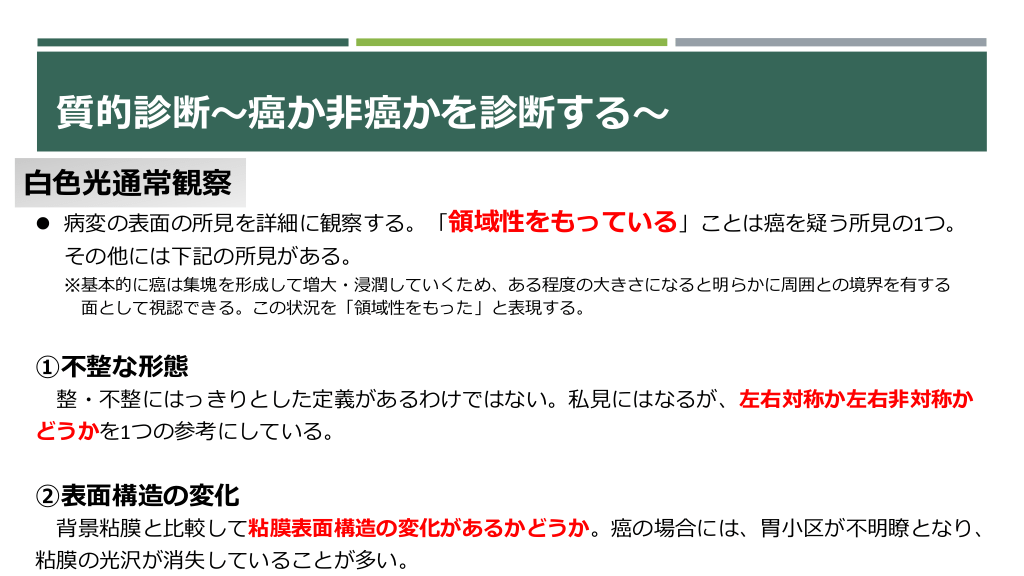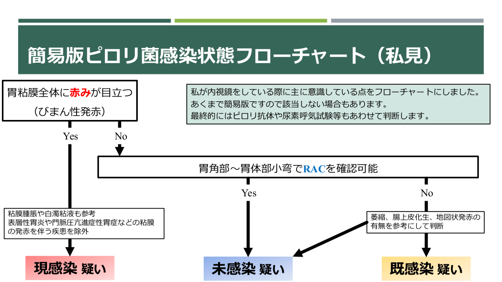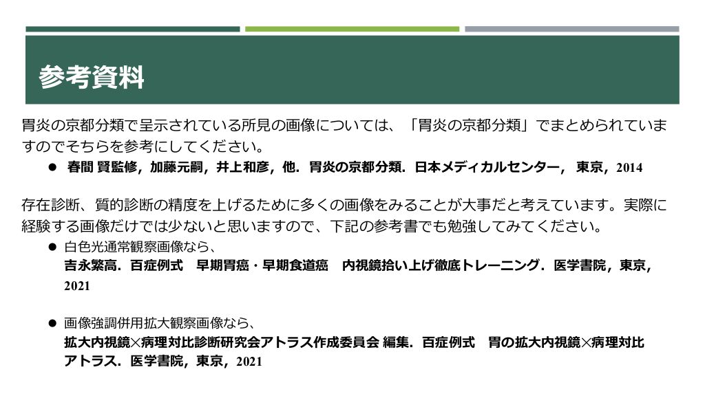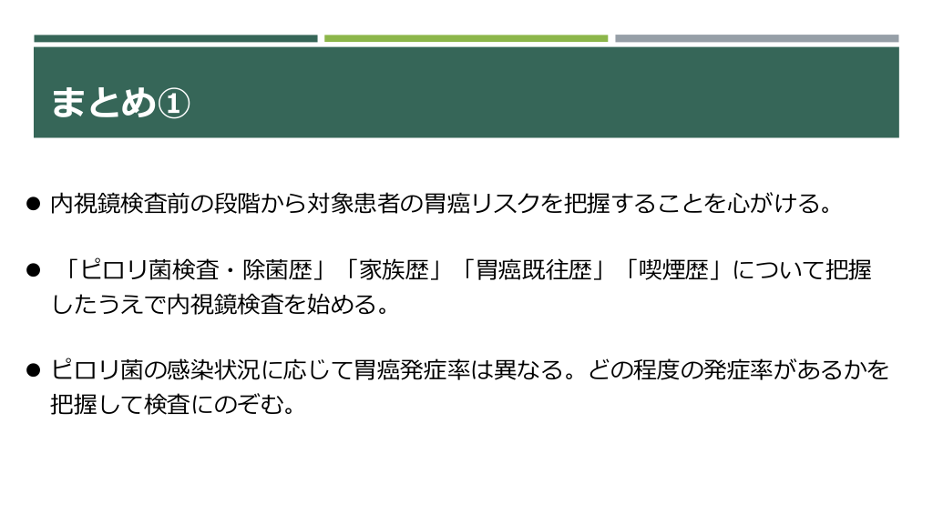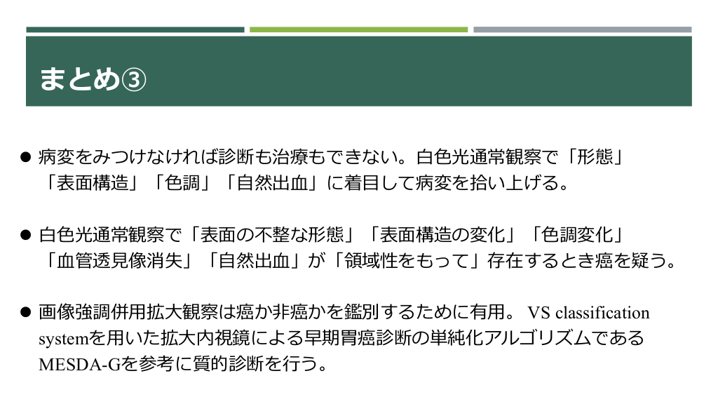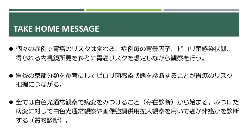TAKE HOME MESSAGE l 個々の症例で胃癌のリスクは変わる。症例毎の背景因⼦、ピロリ菌感染状態、 得られる内視鏡所⾒を参考に胃癌リスクを想定しながら観察を⾏う。 l 胃炎の京都分類を参考にしてピロリ菌感染状態を診断することが胃癌のリスク 把握につながる。 l 全ては⽩⾊光通常観察で病変をみつけること(存在診断)から始まる。みつけた 病変に対して⽩⾊光通常観察や画像強調併⽤拡⼤観察を⽤いて癌か⾮癌かを診断 する(質的診断)。