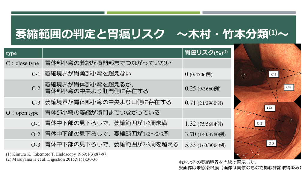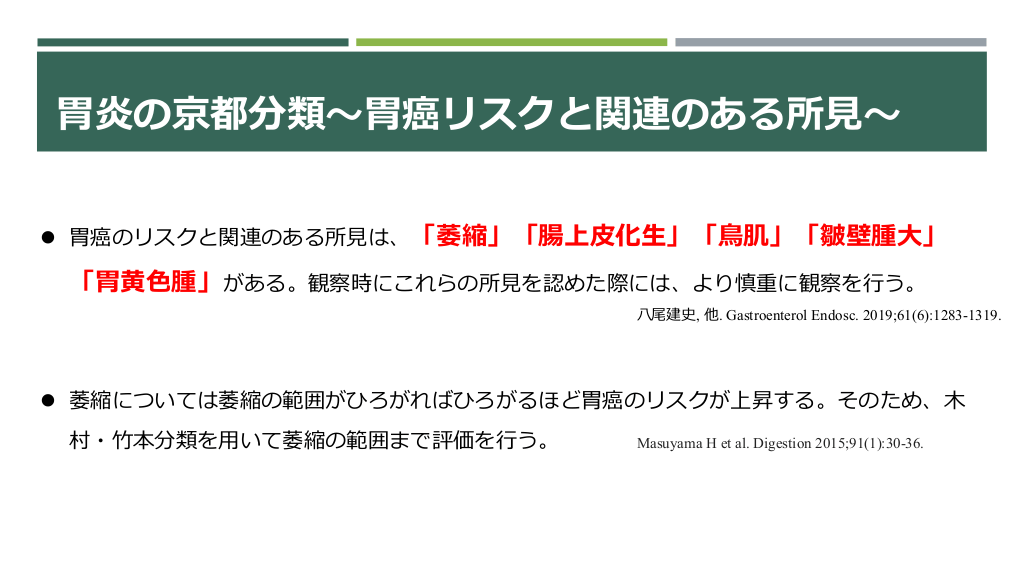 胃炎の京都分類〜胃癌リスクと関連のある所⾒〜 l 胃癌のリスクと関連のある所⾒は、「萎縮」「腸上⽪化⽣」「⿃肌」「皺壁腫⼤」 「胃⻩⾊腫」がある。観察時にこれらの所⾒を認めた際には、より慎重に観察を⾏う。 ⼋尾建史, 他. Gastroenterol Endosc. 2019;61(6):1283-1319. l 萎縮については萎縮の範囲がひろがればひろがるほど胃癌のリスクが上昇する。そのため、⽊ 村・⽵本分類を⽤いて萎縮の範囲まで評価を⾏う。 Masuyama H et al. Digestion 2015;91(1):30-36.