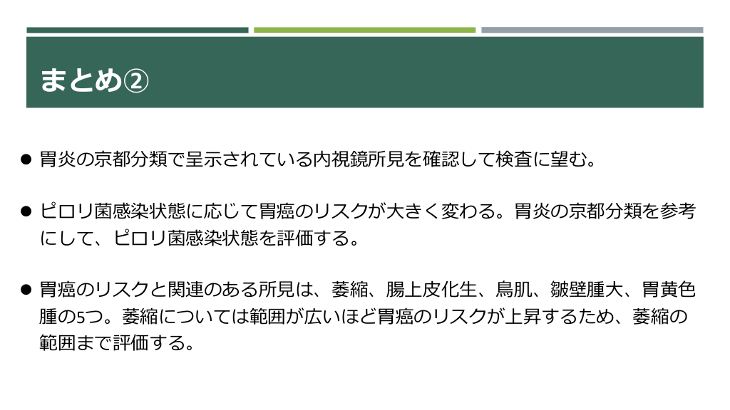 まとめ② l 胃炎の京都分類で呈⽰されている内視鏡所⾒を確認して検査に望む。 l ピロリ菌感染状態に応じて胃癌のリスクが⼤きく変わる。胃炎の京都分類を参考 にして、ピロリ菌感染状態を評価する。 l 胃癌のリスクと関連のある所⾒は、萎縮、腸上⽪化⽣、⿃肌、皺壁腫⼤、胃⻩⾊ 腫の5つ。萎縮については範囲が広いほど胃癌のリスクが上昇するため、萎縮の 範囲まで評価する。
