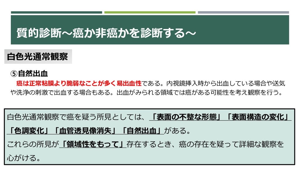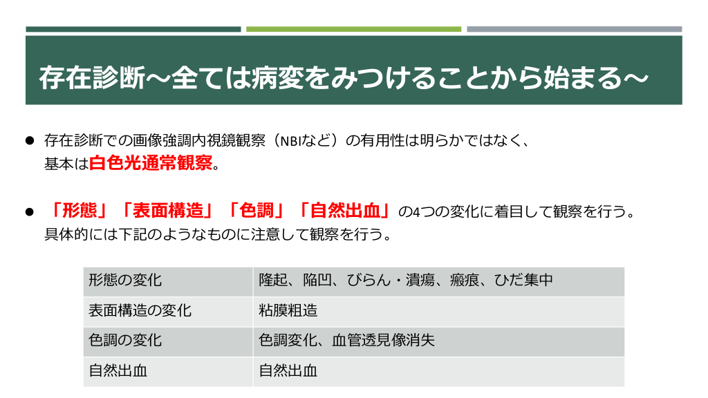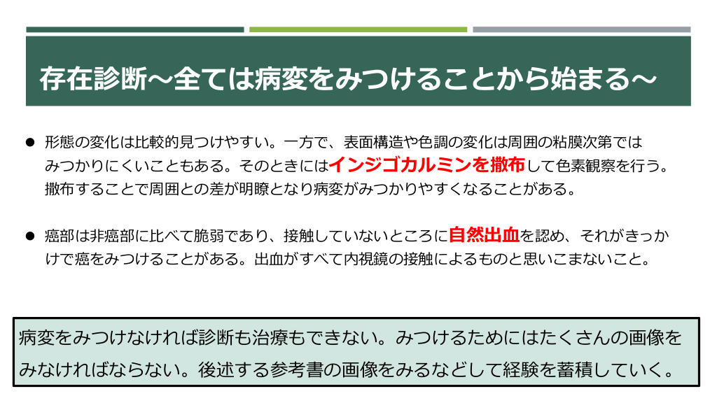 存在診断〜全ては病変をみつけることから始まる〜 l 形態の変化は⽐較的⾒つけやすい。⼀⽅で、表⾯構造や⾊調の変化は周囲の粘膜次第では みつかりにくいこともある。そのときにはインジゴカルミンを撒布して⾊素観察を⾏う。 撒布することで周囲との差が明瞭となり病変がみつかりやすくなることがある。 l 癌部は⾮癌部に⽐べて脆弱であり、接触していないところに⾃然出⾎を認め、それがきっか けで癌をみつけることがある。出⾎がすべて内視鏡の接触によるものと思いこまないこと。 病変をみつけなければ診断も治療もできない。みつけるためにはたくさんの画像を みなければならない。後述する参考書の画像をみるなどして経験を蓄積していく。