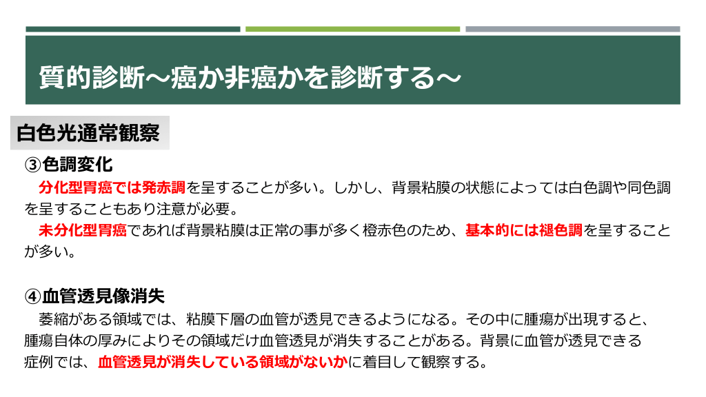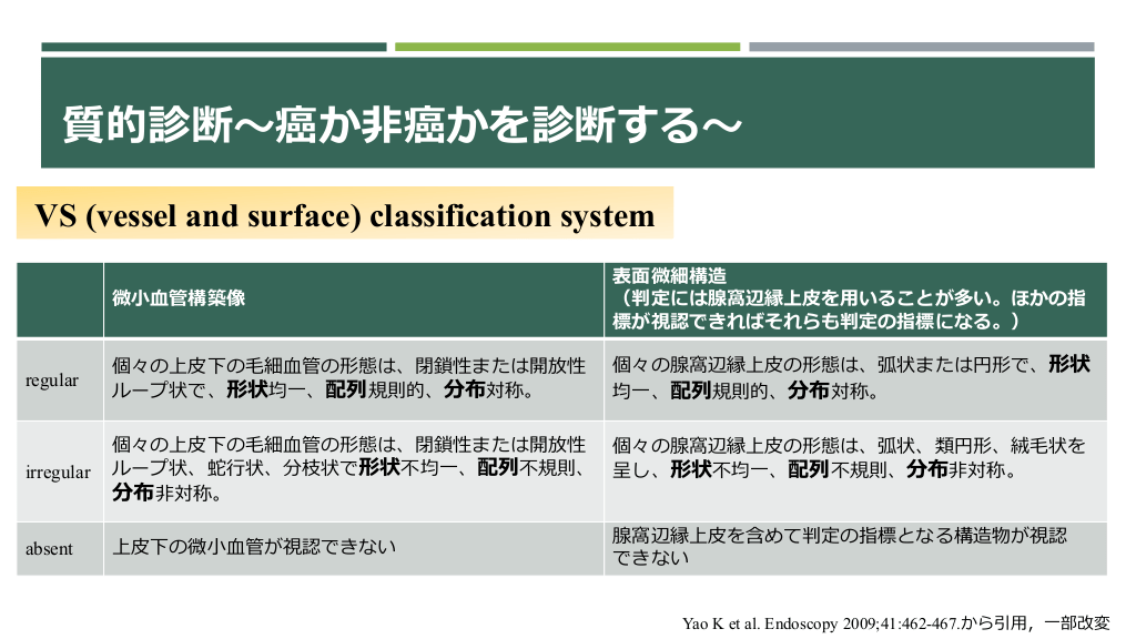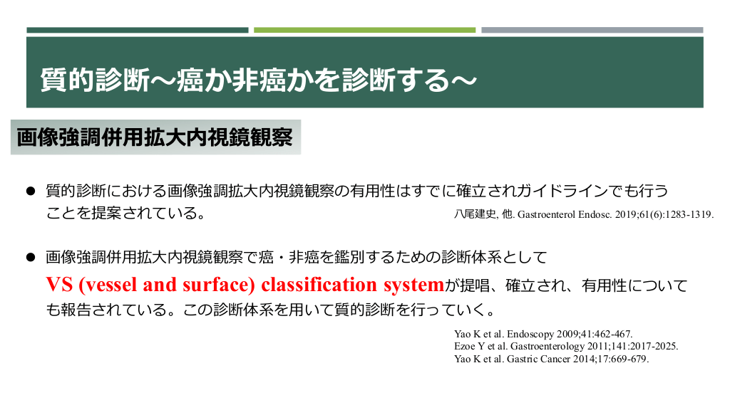 質的診断〜癌か⾮癌かを診断する〜 画像強調併⽤拡⼤内視鏡観察 l 質的診断における画像強調拡⼤内視鏡観察の有⽤性はすでに確⽴されガイドラインでも⾏う ⼋尾建史, 他. Gastroenterol Endosc. 2019;61(6):1283-1319. ことを提案されている。 l 画像強調併⽤拡⼤内視鏡観察で癌・⾮癌を鑑別するための診断体系として VS (vessel and surface) classification systemが提唱、確⽴され、有⽤性について も報告されている。この診断体系を⽤いて質的診断を⾏っていく。 Yao K et al. Endoscopy 2009;41:462-467. Ezoe Y et al. Gastroenterology 2011;141:2017-2025. Yao K et al. Gastric Cancer 2014;17:669-679.