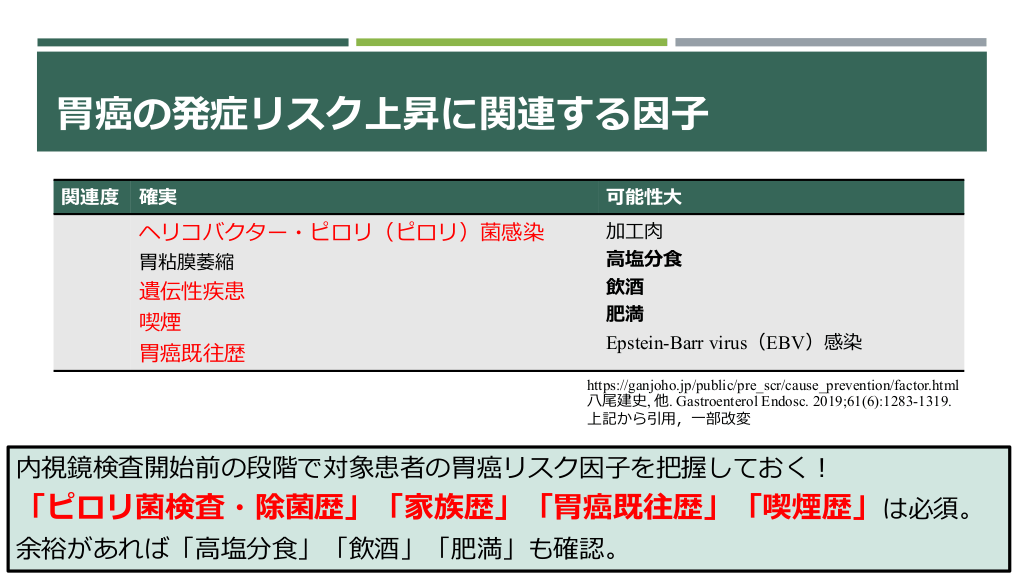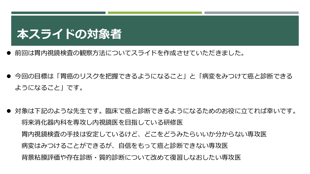 本スライドの対象者 l 前回は胃内視鏡検査の観察⽅法についてスライドを作成させていただきました。 l 今回の⽬標は「胃癌のリスクを把握できるようになること」と「病変をみつけて癌と診断できる ようになること」です。 l 対象は下記のような先⽣です。臨床で癌と診断できるようになるためのお役に⽴てれば幸いです。 将来消化器内科を専攻し内視鏡医を⽬指している研修医 胃内視鏡検査の⼿技は安定しているけど、どこをどうみたらいいか分からない専攻医 病変はみつけることができるが、⾃信をもって癌と診断できない専攻医 背景粘膜評価や存在診断・質的診断について改めて復習しなおしたい専攻医