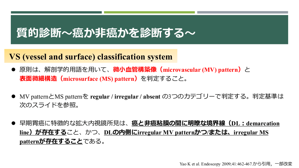 質的診断〜癌か⾮癌かを診断する〜 VS (vessel and surface) classification system l 原則は、解剖学的⽤語を⽤いて、微⼩⾎管構築像(microvascular (MV) pattern)と 表⾯微細構造(microsurface (MS) pattern)を判定すること。 l MV patternとMS patternを regular / irregular / absent の3つのカテゴリーで判定する。判定基準は 次のスライドを参照。 l 早期胃癌に特徴的な拡⼤内視鏡所⾒は、癌と⾮癌粘膜の間に明瞭な境界線(DL︓demarcation line)が存在すること、かつ、DLの内側にirregular MV patternかつ/または、irregular MS patternが存在することである。 Yao K et al. Endoscopy 2009;41:462-467.から引⽤,⼀部改変