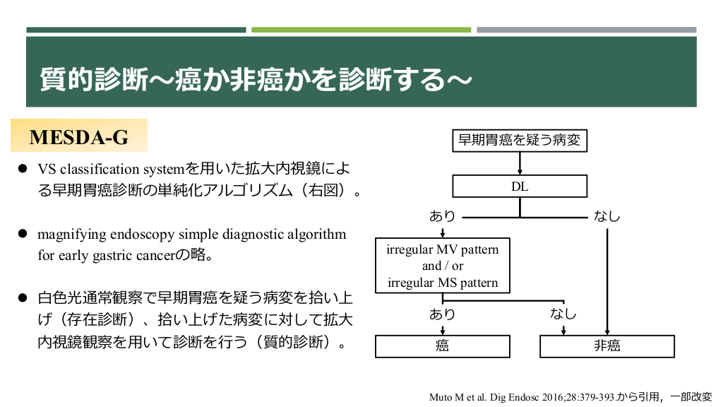 質的診断〜癌か⾮癌かを診断する〜 MESDA-G 早期胃癌を疑う病変 l VS classification systemを⽤いた拡⼤内視鏡によ る早期胃癌診断の単純化アルゴリズム(右図)。 l magnifying endoscopy simple diagnostic algorithm for early gastric cancerの略。 l ⽩⾊光通常観察で早期胃癌を疑う病変を拾い上 げ(存在診断)、拾い上げた病変に対して拡⼤ 内視鏡観察を⽤いて診断を⾏う(質的診断)。 DL あり なし irregular MV pattern and / or irregular MS pattern あり 癌 なし ⾮癌 Muto M et al. Dig Endosc 2016;28:379-393.から引⽤,⼀部改変