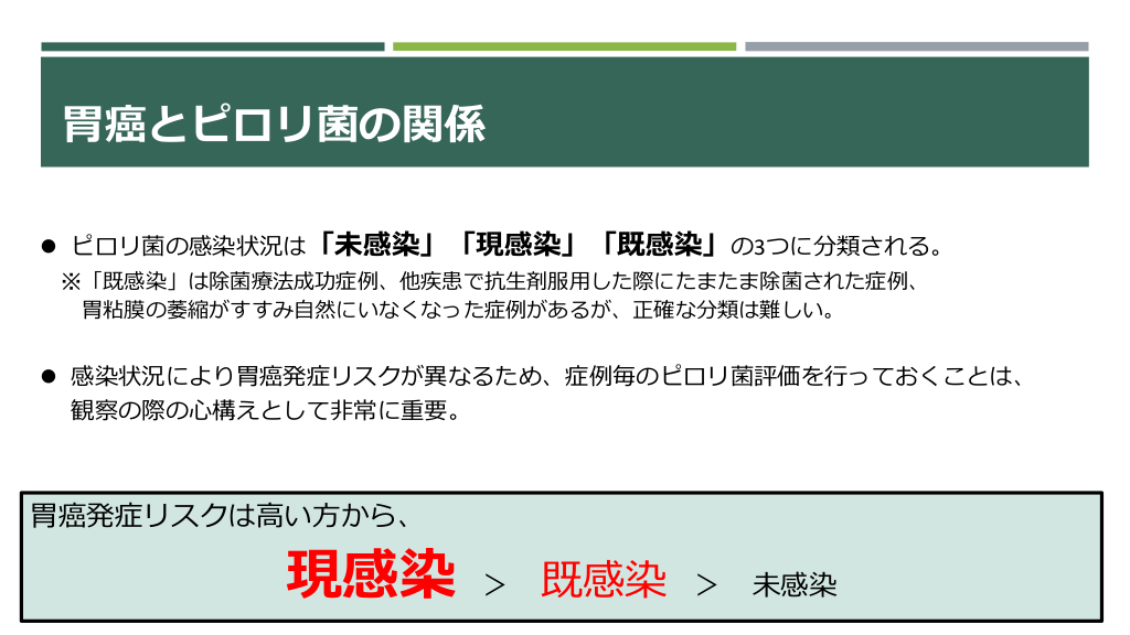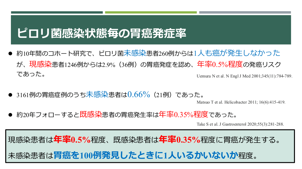 ピロリ菌感染状態毎の胃癌発症率 l 約10年間のコホート研究で、ピロリ菌未感染患者260例からは1⼈も癌が発⽣しなかった が、現感染患者1246例からは2.9%(36例)の胃癌発症を認め、年率0.5%程度の発癌リスク であった。 Uemura N et al. N Engl J Med 2001;345(11):784-789. l 3161例の胃癌症例のうち未感染患者は0.66%(21例)であった。 Matsuo T et al. Helicobacter 2011; 16(6):415-419. l 約20年フォローすると既感染患者の胃癌発⽣率は年率0.35%程度であった。 Take S et al. J Gastroenterol 2020;55(3):281-288. 現感染患者は年率0.5%程度、既感染患者は年率0.35%程度に胃癌が発⽣する。 未感染患者は胃癌を100例発⾒したときに1⼈いるかいないか程度。