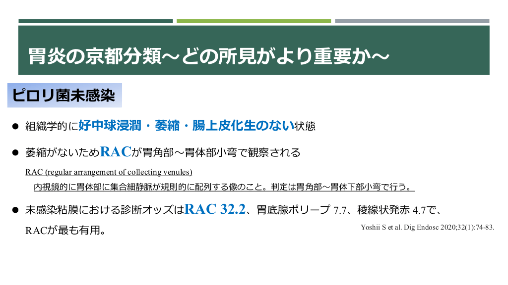 胃炎の京都分類〜どの所⾒がより重要か〜 ピロリ菌未感染 l 組織学的に好中球浸潤・萎縮・腸上⽪化⽣のない状態 l 萎縮がないためRACが胃⾓部〜胃体部⼩弯で観察される RAC (regular arrangement of collecting venules) 内視鏡的に胃体部に集合細静脈が規則的に配列する像のこと。判定は胃⾓部〜胃体下部⼩弯で⾏う。 l 未感染粘膜における診断オッズはRAC RACが最も有⽤。 32.2、胃底腺ポリープ 7.7、稜線状発⾚ 4.7で、 Yoshii S et al. Dig Endosc 2020;32(1):74-83.