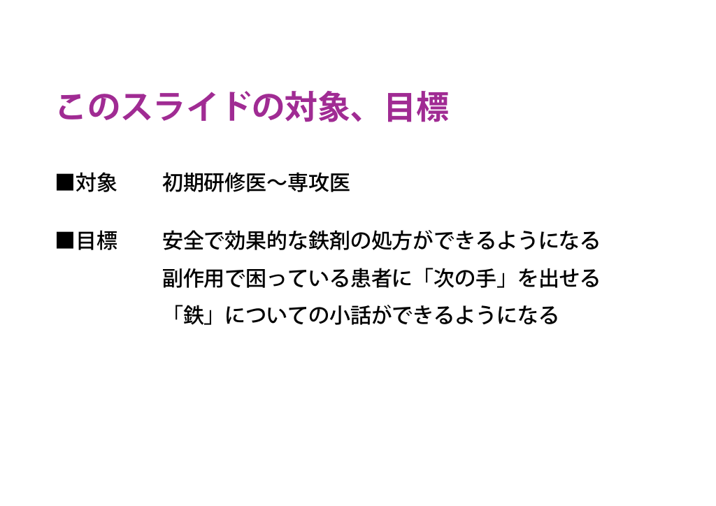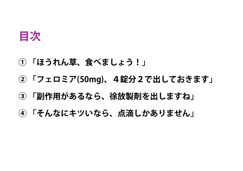 10年以上前の鉄剤処方の常識や、添付文書通りの処方では上手くいきません。出来るだけ上手くいく確率を上げるためにスライドを作成しました。参考にしていただけると幸いです。