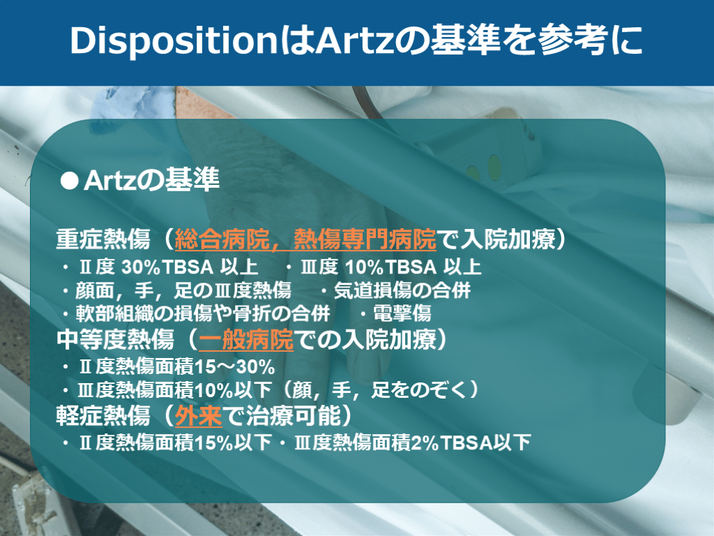 ・Ⅱ度熱傷面積15%以下・Ⅲ度熱傷面積2%TBSA以下