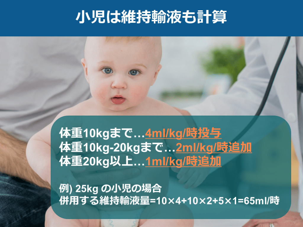 #10. 小児は維持輸液も計算 体重10kgまで…4ml/kg/時投与