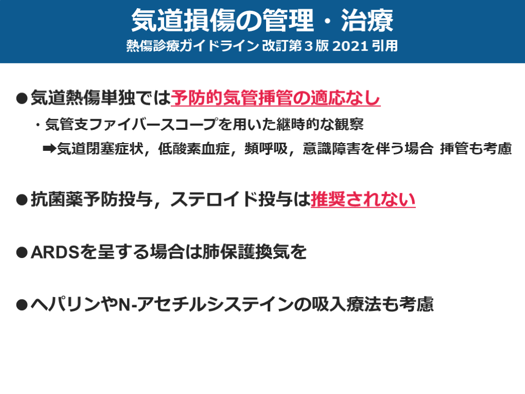 熱傷診療ガイドライン 改訂第3版 2021 引用 ●気道熱傷単独では予防的気管挿管の適応なし